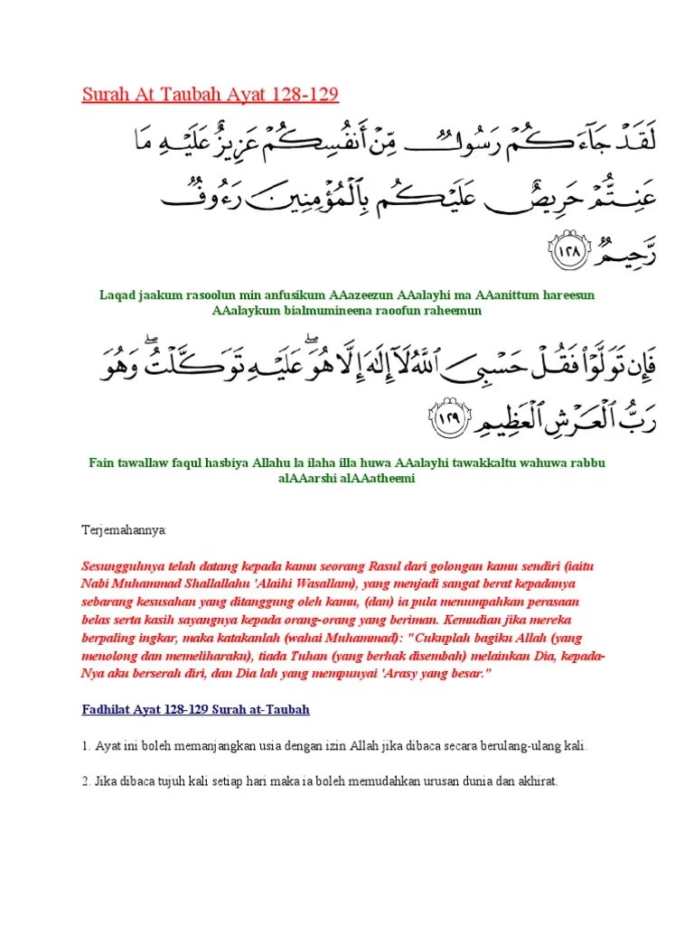Wiridkan secara istiqomah 7 x . Surah at taubah ada 129 ayat dan turun di madinah. Alhamdulillah, sesungguhnya dia (allah swt) jualah yang memberi ilham untuk kak ji selami maksud maksud ayat tersebut. Tafsir ibnu katsir surah at taubah ayat 128 129 alqur anmulia. Sesungguhnya, telah datang kepada kamu seorang rasul dari golongan kamu sendiri (iaitu nabi muhammad s.a.w.), yang menjadi .